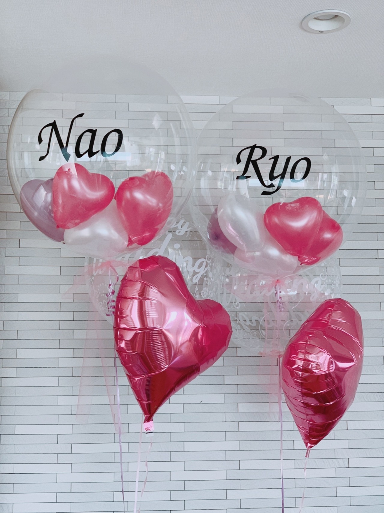 結婚式場をかざるクリアバルーンのアレンジです。新郎新婦様のお名前を入れての2セットでお届けします。高砂に飾っても素敵です。