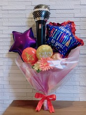 カラオ好きな方にピッタリな花束バルーン 。マイクのバルーンは、大変喜ばれます。おじいちゃん、おばあちゃんにプレゼントされてもいいですね。多目的で贈ることができます。喜寿、古希、米寿など、文字入れ可能です。少し落ち着いた雰囲気でおじいちゃん、おばあちゃんにも喜ばれています。