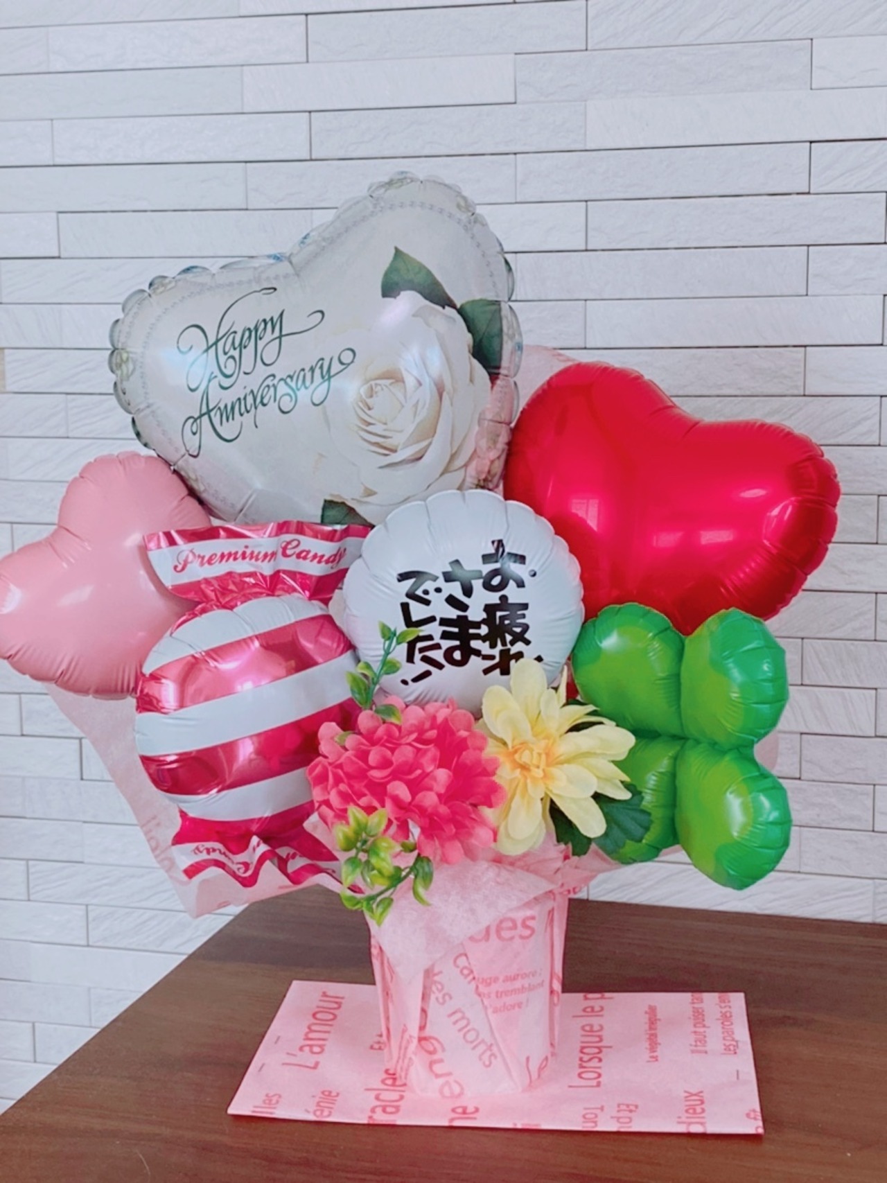 ハッピーアニバーサリーのバルーン使っています。お祝いや記念日にピッタリです。置き型Sサイズですが、大きすぎず、小さすぎず、ちょうどいい大きさです。